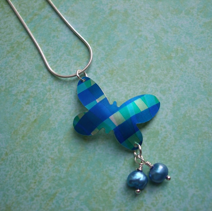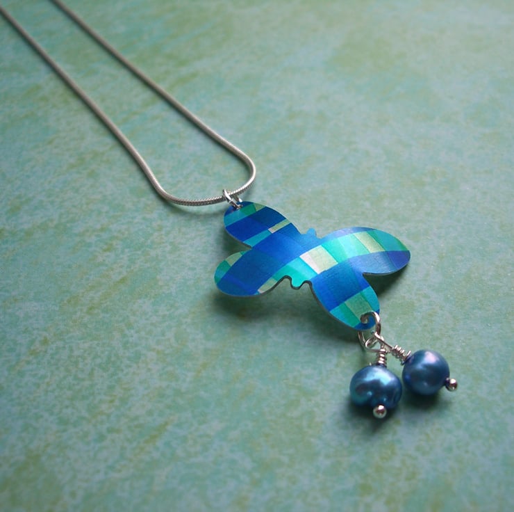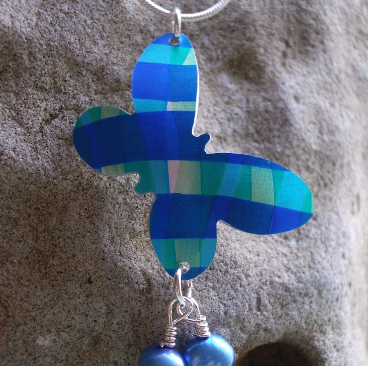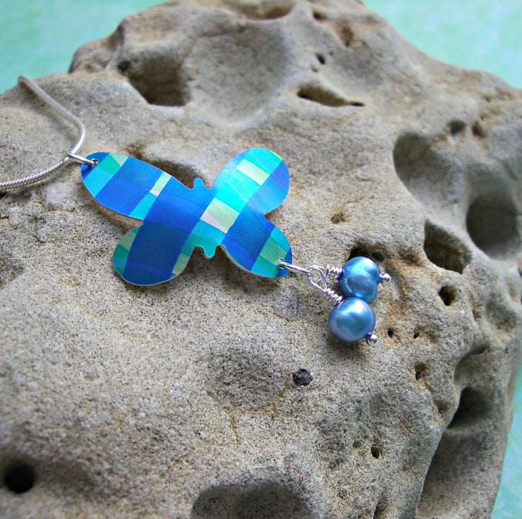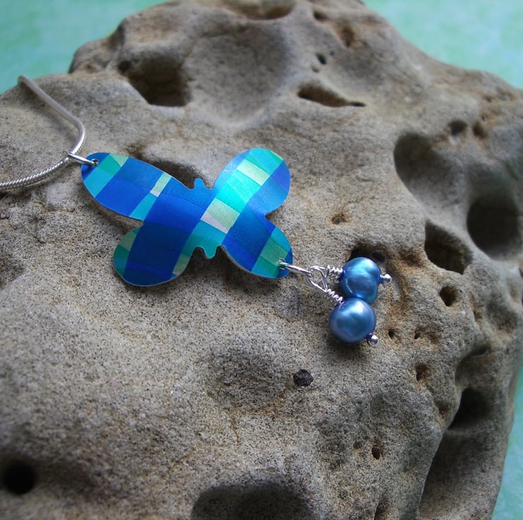 The butterfly hangs from a sterling silver hoop and I have added two blue freshwater pearls which dangle from sterling silver pins.