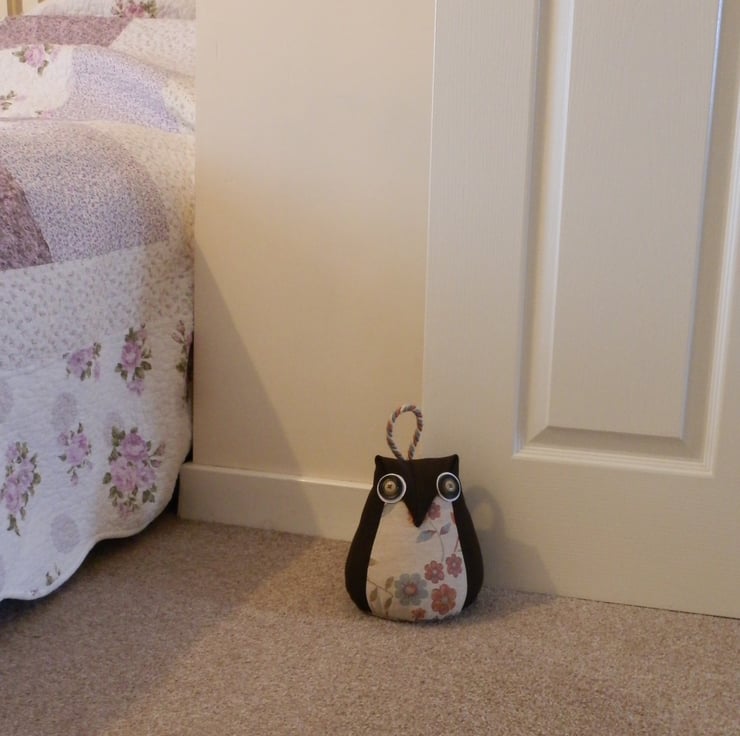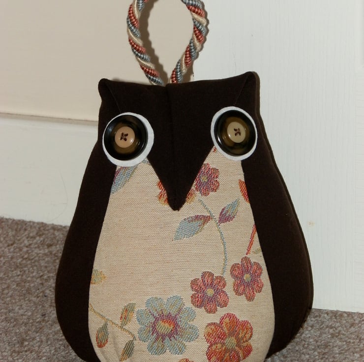 Brown fabric owl, with floral insert. Vintage button eyes. Weighting 870g approximately.
