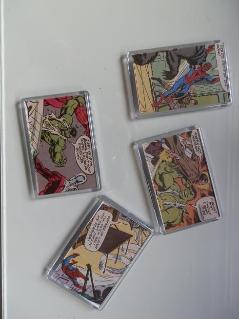 Hand-cut illustrations from Marvel or DC Comics. Featuring Spiderman, Incredible Hulk, Batman & Superman. One-off images, so designs may change from those pictured. Each magnet costs £2. Reduced postage for multiple purchases, please email for costing.