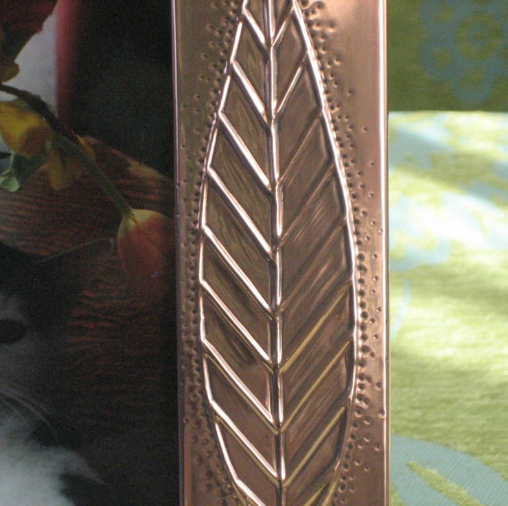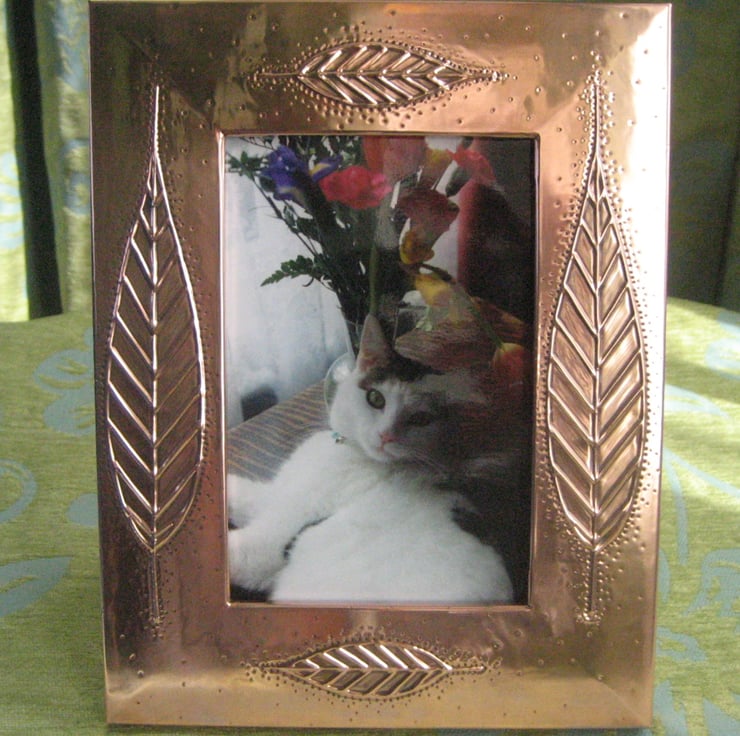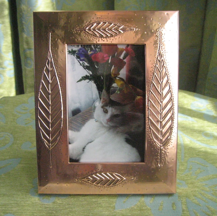 This frame has been handmade using the repousse method popular with the Arts and Crafts movement. It measures 173 x 220mm overall and will take a 4 x 6 inch photograph. The reverse, which is covered in black velour, has a stand and a ring for hanging.
