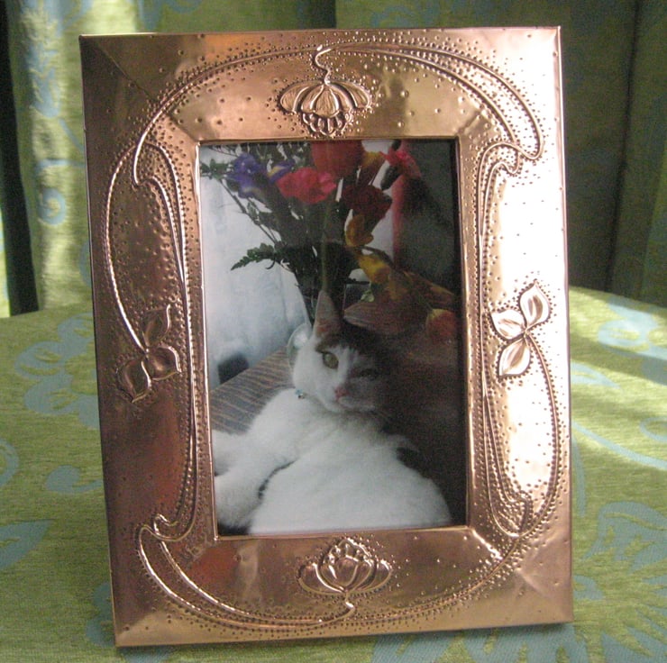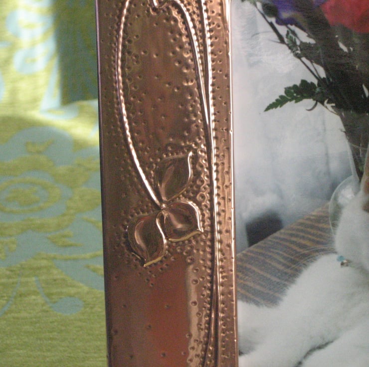 This frame has been handmade using the repousse method popular with the Arts and Crafts movement. The Art Nouveau design is asymmetrical and can be used with a portrait or landscape photo. It measures 173 x 220mm overall and will take a 4 x 6 inch photograph. The reverse, which is covered in black velour, has a stand and a rings for hanging in either position.