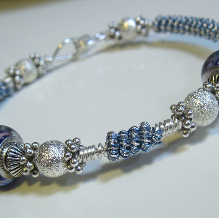 Silver plated and blue twisted wire bangle. Accentuated with lovely blue glass Pandora style beads. Silver plated stardust beads and tibetan silver spacers.