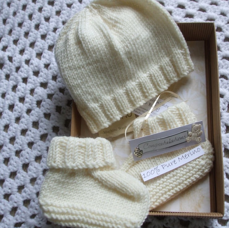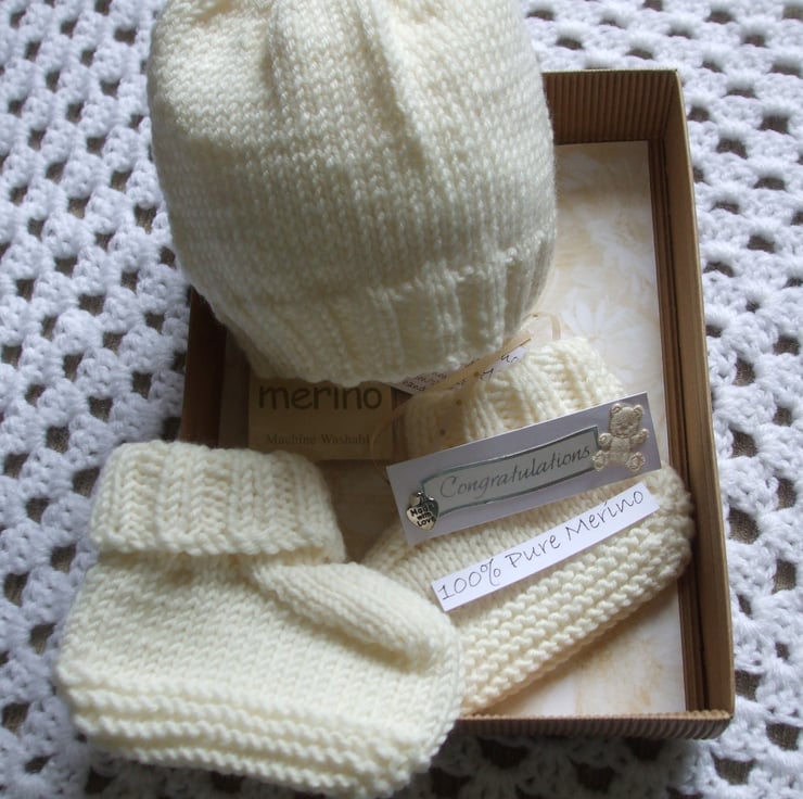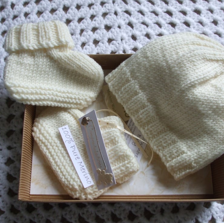 It is knitted in a cream pure merino yarn and comes packaged in a gift box with tag ready for you to give with love.