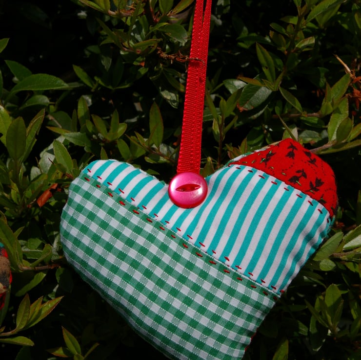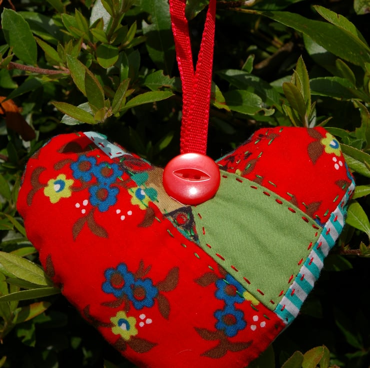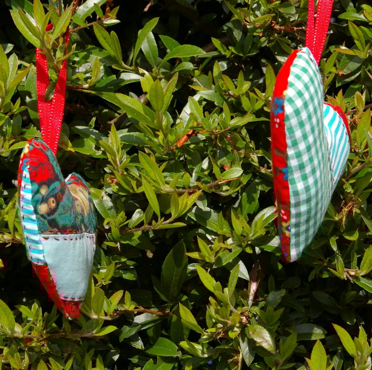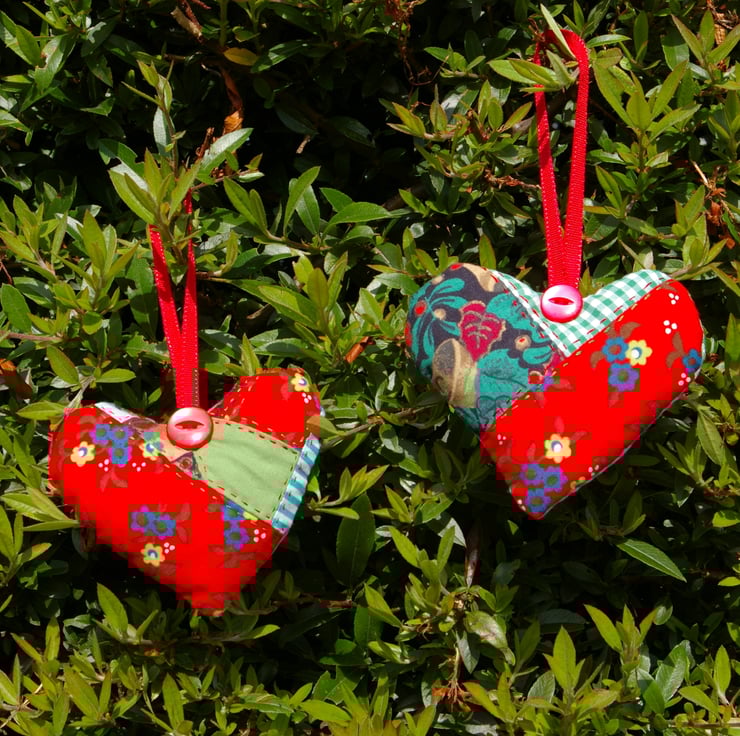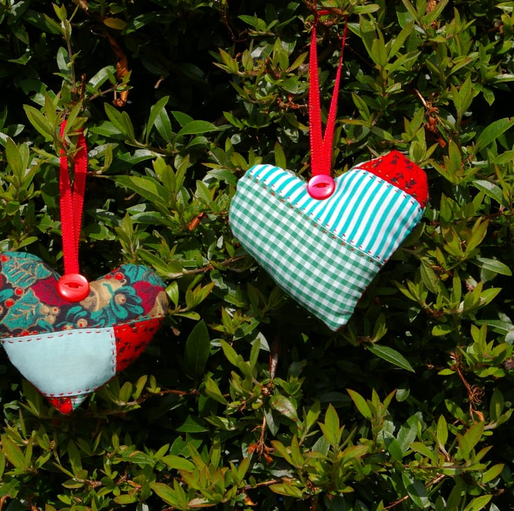 A pair of patchwork scented Christmas heart decorations. The Christmas hearts are completely hand-sewn and highlighted in shiny rayon red and green threads. They are filled with a mix of hypo allergenic stuffing and freshly crushed nutmeg, cinnamon, vanilla and dried orange peal. Each heart is patterned differently due to the nature of patchwork. The pattern also differs on both sides of each decoration. They are decorated with a red button on both sides along with a long red ribbon hanging loop.