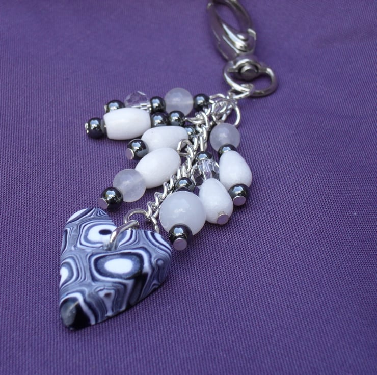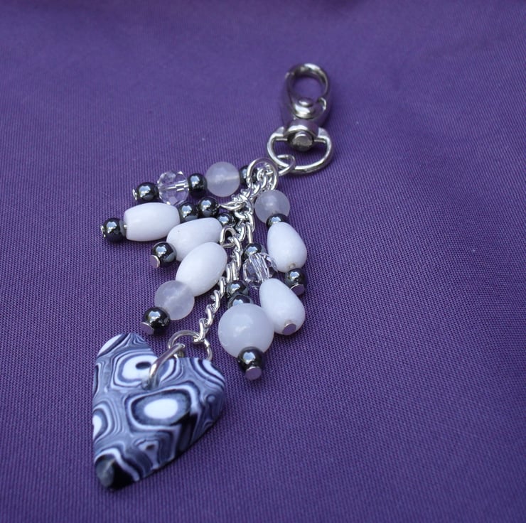 Black and white with a hint of silver handmade heart in polymer clay, has white chinese jade(quartzite) and hematite with a couple of crystals measures 4 1/2 inches(11.5 cm).attached to silver tone chain and clasp.