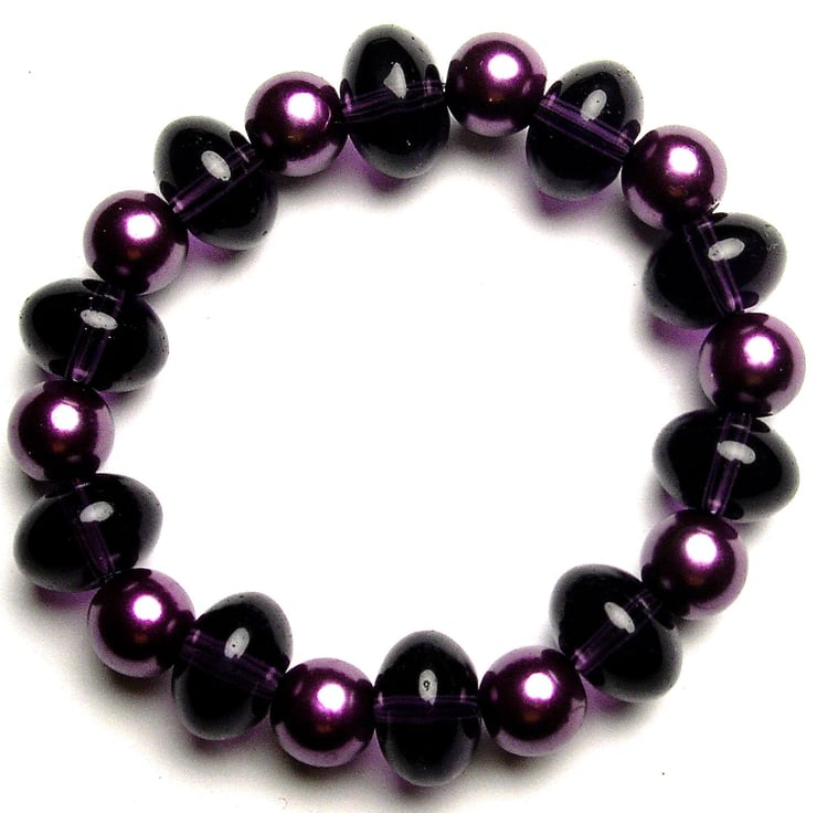 This beautiful bracelet is elasticated and is made from large purple faux pearl and glass beads.