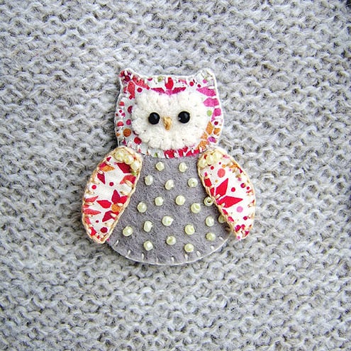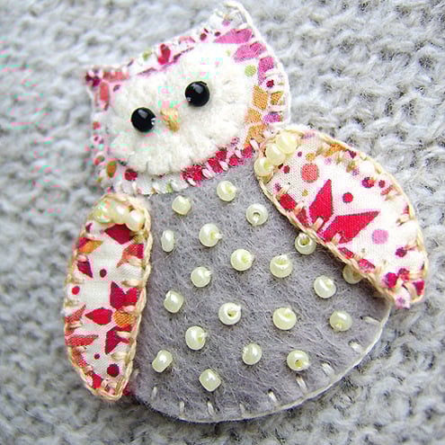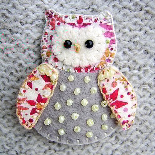 This is a lovely handmade owl brooch. It features Liberty print appliqued head and wings on a grey felt body. The chest is dotted with pretty cream beads.