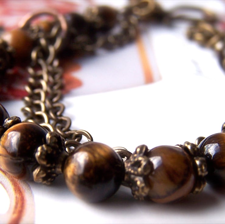 The bracelet fastens with an antique brass finish S clasp, from which a tiger eye stone dangle is suspended.