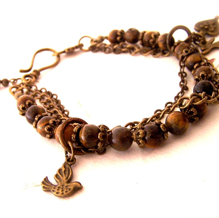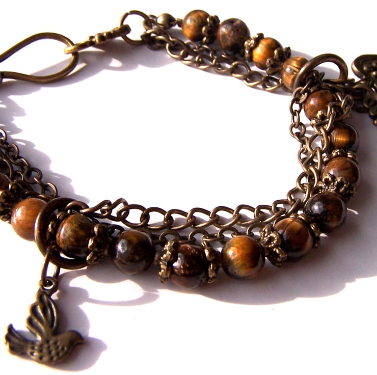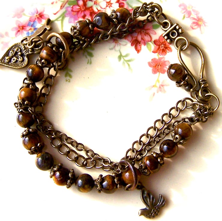 Tiger Eye Bracelet, Gemstone Bracelet, Multistrand Brass Charm Bracelet