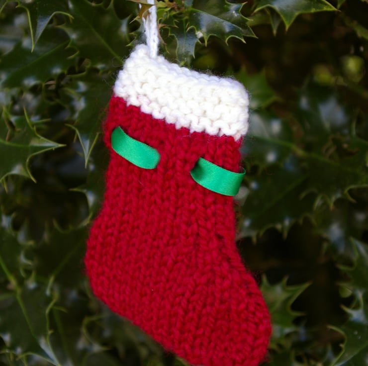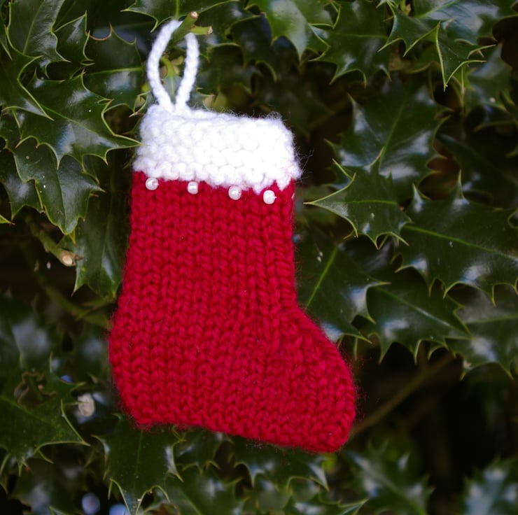 A trio of little hand knitted Christmas stocking decorations that will look great hanging from a Christmas tree or adoring a Christmas window, or hanging off door handles. They are big enough to place a little treat into. Each one is decorated with in a different manner. One has a knitted pattern around the top, while one has a green ribbon thread through the top while the third has shiny white beads sewn around the top. All three are topped in white and have a little white crochet hanging loop