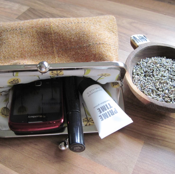 A beautiful, 100% Scottish Harris Tweed tartan-patterned clutch purse with a contrasting cotton lining.