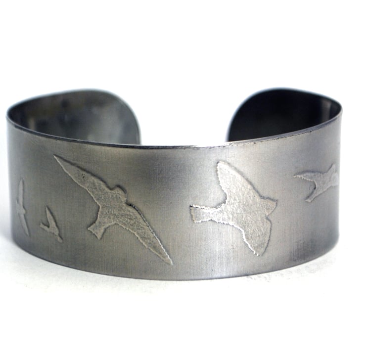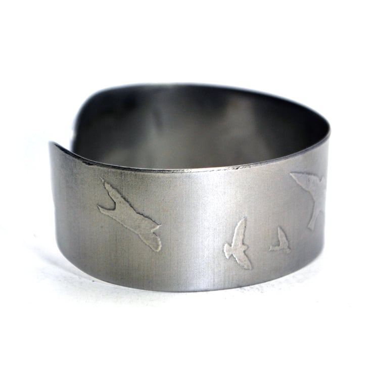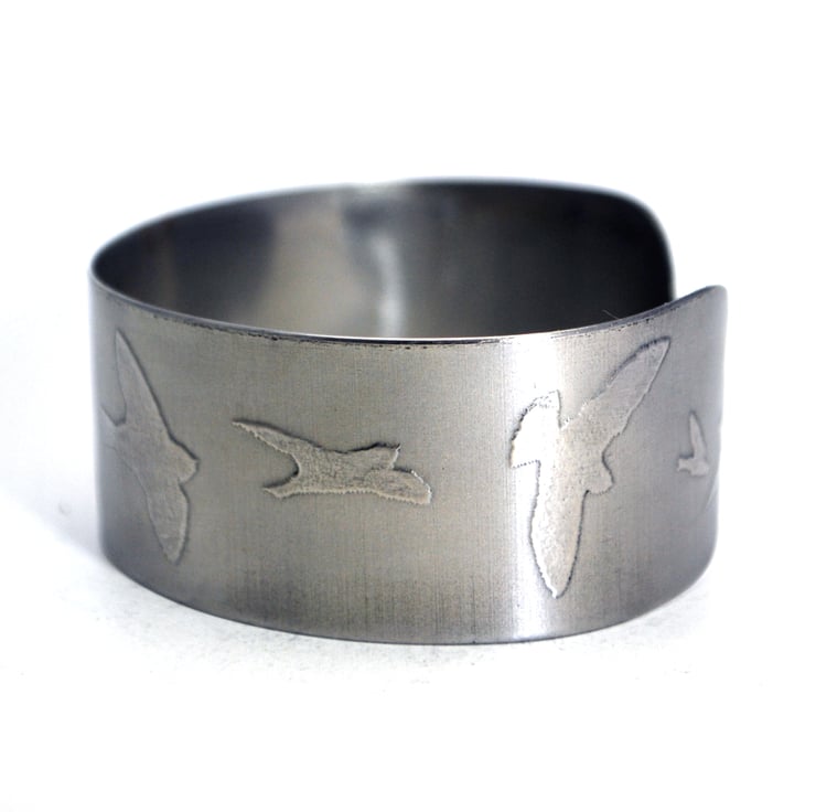 This steel silver cuff has the image of flying birds etched onto the surgical steel surface, polished to create definition and contrast. I use environmentally friendly etching processes when producing my designs, and each piece is subtly unique. This will not tarnish as it is polished stainless steel: it is often mistaken as silver, but I would say it is more the colour of raw platinum.
