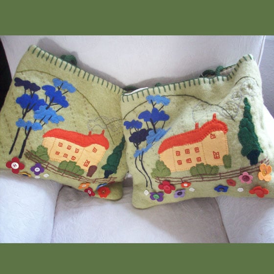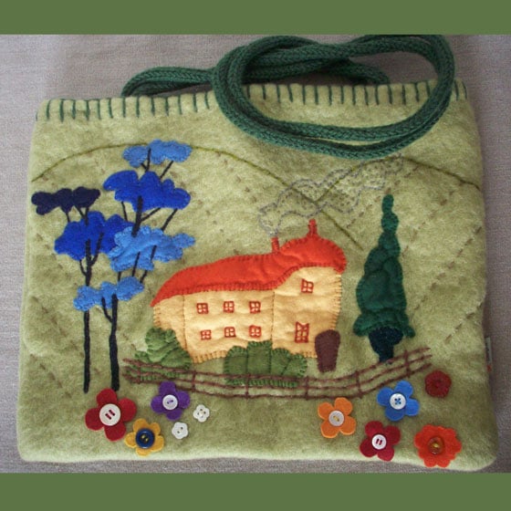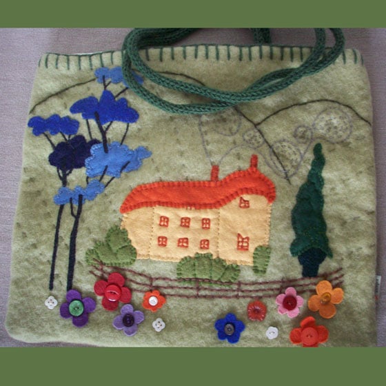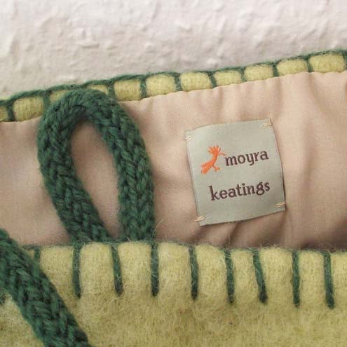 Lovers of 1930s pottery won't need to be told why this bag has this title! It is made in lovely soft blanket fabric providing a green background for the vintage illustration. The style of the embroidered felt applique, embellished with buttons, echoes the famous designer. The button fastening at the back of the bag is handmade with a recycled plastic core. The bag is fully lined with cotton and the French knitting tube shoulder strap is reinforced. Designer/maker label set into the side seam and also in the lining. Please ask about multiple and non-UK postage as prices vary.