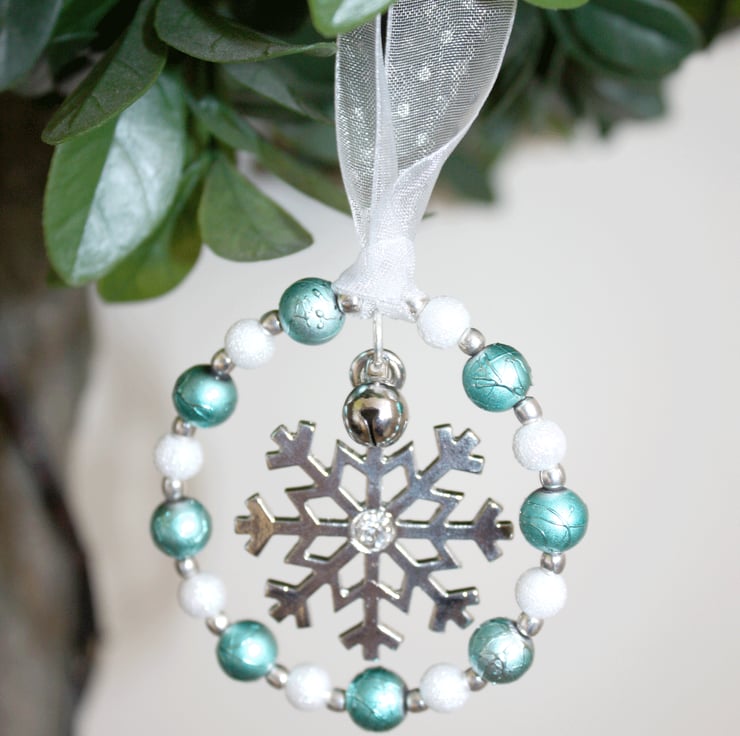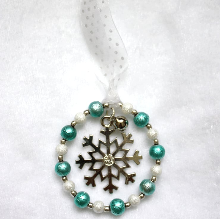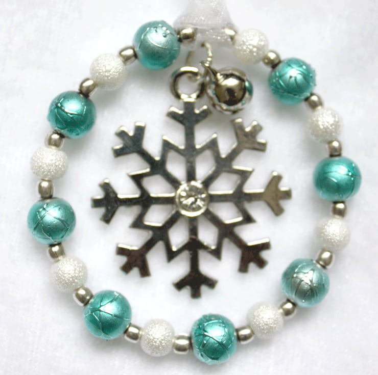 This Christmas Tree Decoration is made from turquoise and white textured glass pearl beads and silver plated spacer beads threaded onto memory wire to keep it's shape. It has a metal snowflake charm and a cute little budgie bell hanging down from the middle. It is finished off with a white organza ribbon with silver spots to hang from your tree.