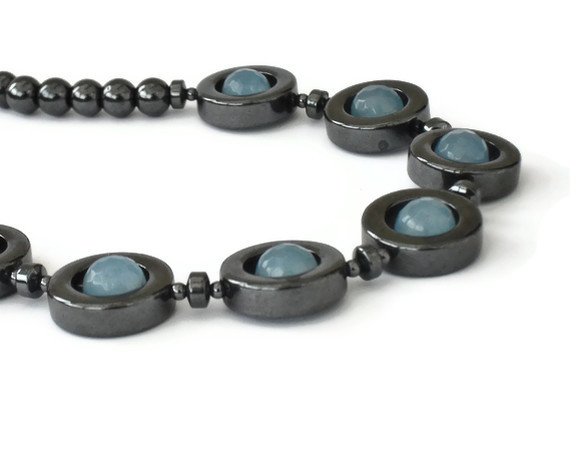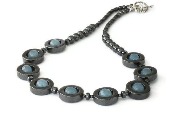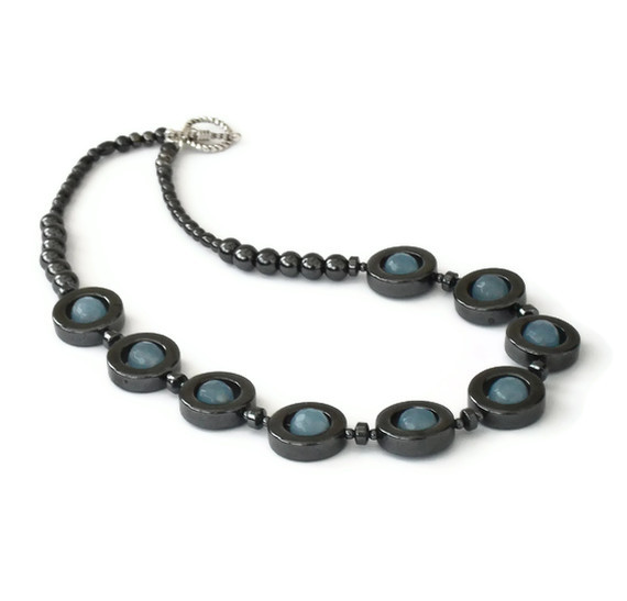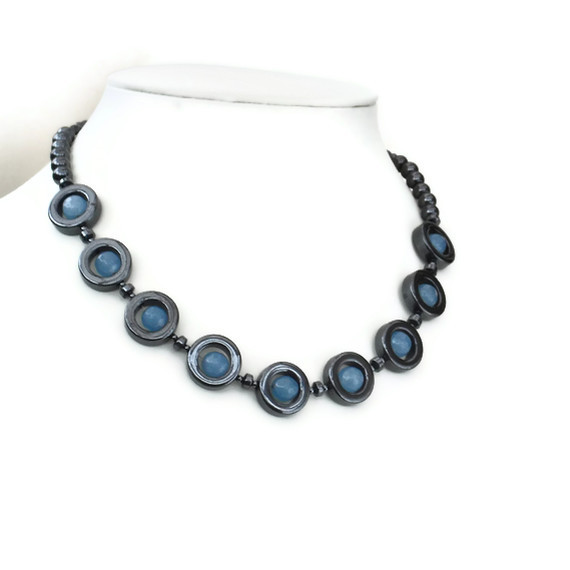 Beautiful faceted blue aquamarines are enclosed within hematite rounds to make this stunning necklace.