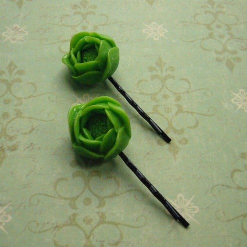 Bright and Delightful- Green Sakura Blossom Cabochon is secured to a flat pad silver or black coloured Hair Slide- let me know after ordering which you'd prefer.