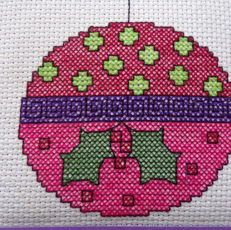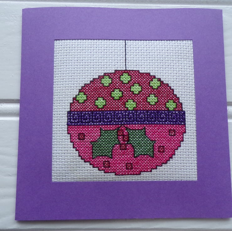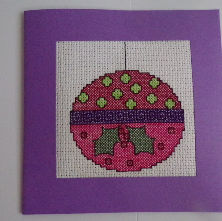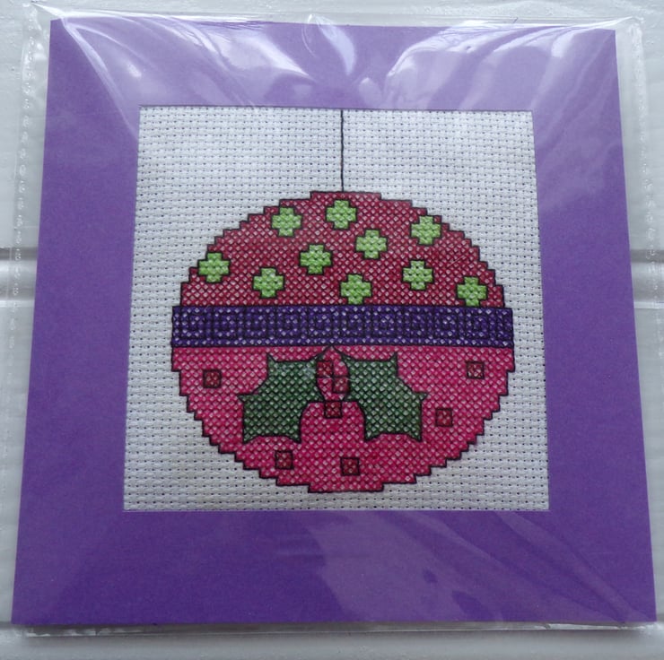 Christmas Card, Handmade Christmas Card, Christmas Greetings Card. A beautiful hand stitched Christmas Card, measuring approximately 14.5cm square. The cross stitched design of a Christmas bauble comes to you in a lovely deep purple aperture card, wadding has been placed behind the stitching to give a padded effect. The card has been left blank for your own message The card comes with a white envelope and arrives to you in a clear cellophane bag for protection.