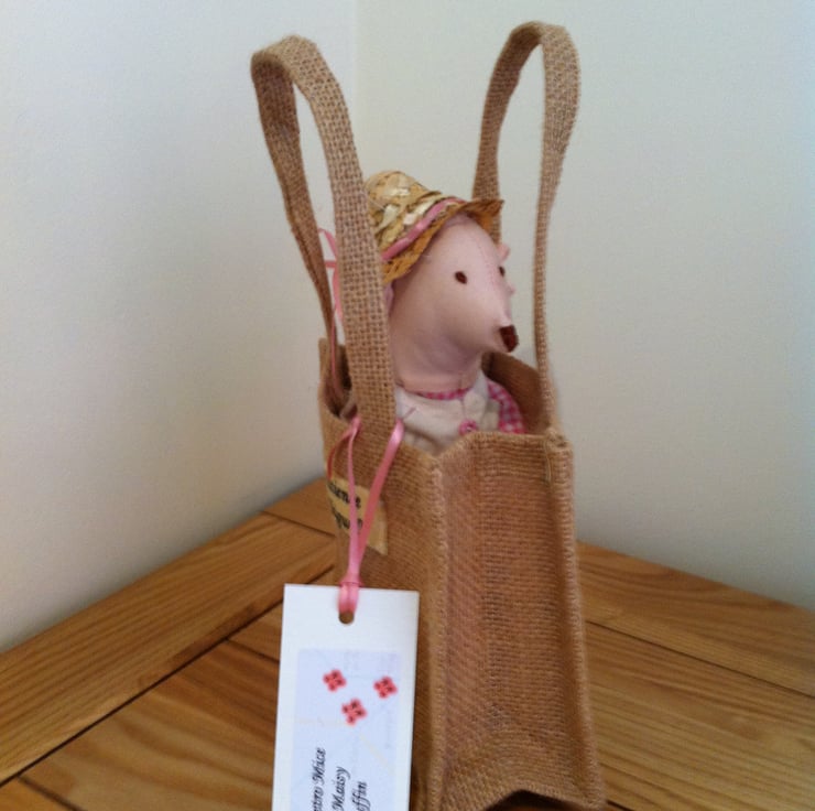 Patience Chigwell is a Metro Mouse. She is made of best quality cotton and is approx 28cm tall. She comes in a jute carry bag decorated with her name.