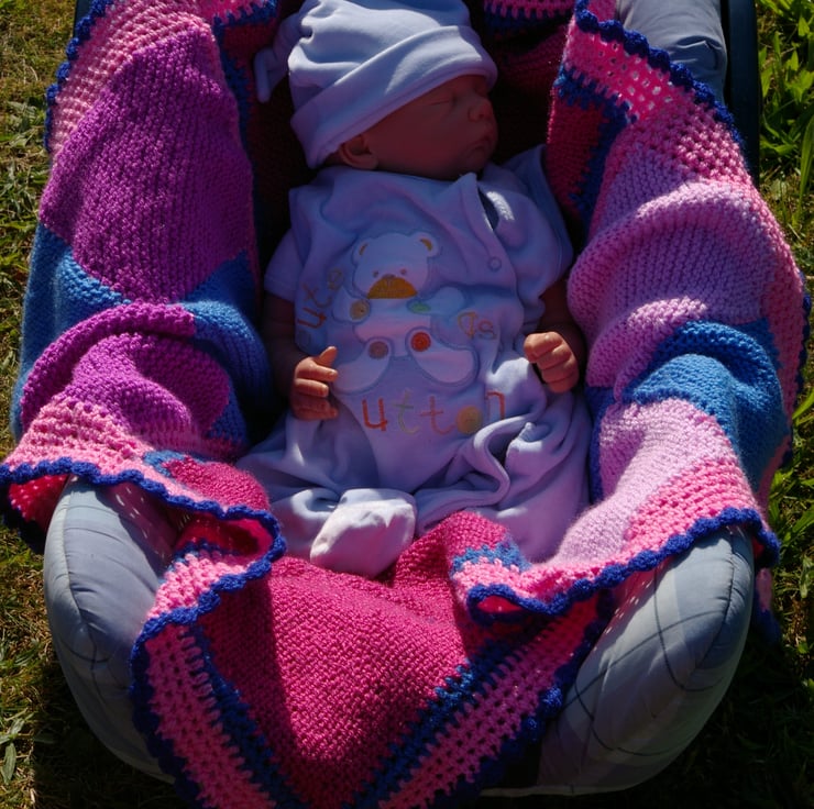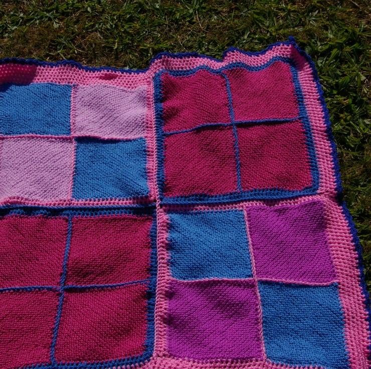 This is a soft cosy blanket/throw knitted and crocheted in 100% Acrylic yarn. I have crocheted a small boarder around each knitted square. I have themed the blanket on pinks, rusts, purples and blues. I’ve finished it with a dark blue crochet shell edge. It makes a nice baby blanket or lap blanket.