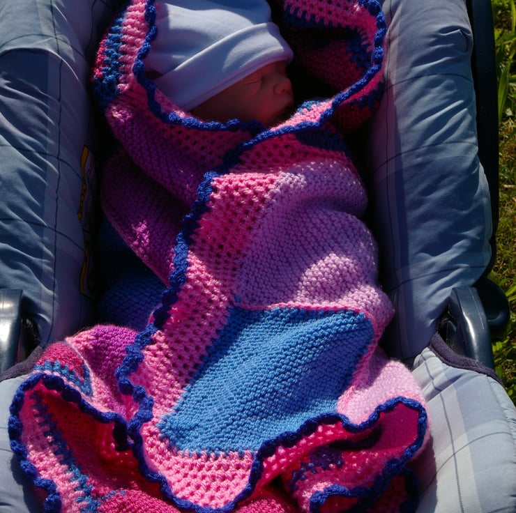 I wanted to use up some of my leftover pink and blue yarns and create something that would be soft and warm as a snuggly lap blanket or baby blanket.