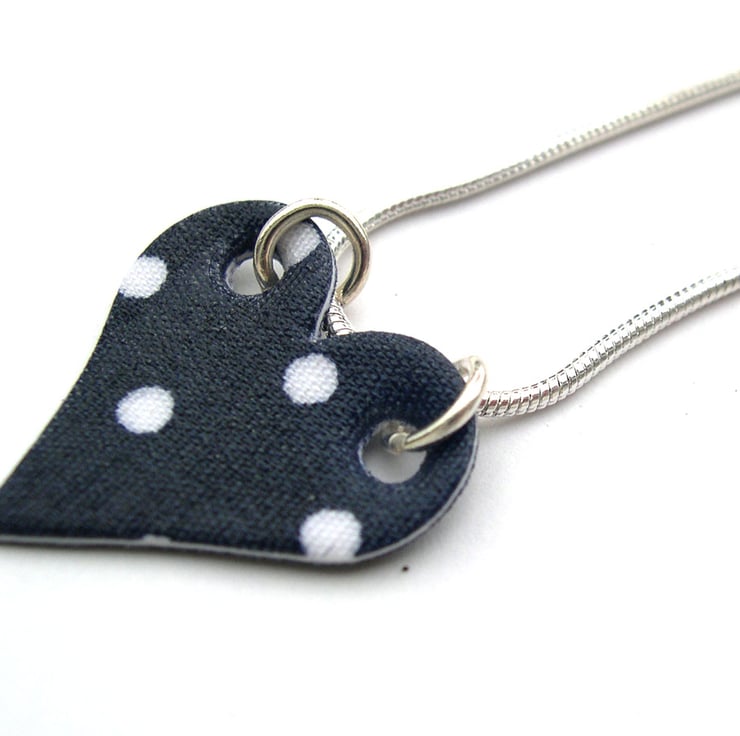This beautiful and unique necklace has been created from offcuts of a navy polka dot print fabric which have been hardened and cut to a heart shape and attached to a silver plated snake chain necklace with lobster fastening.