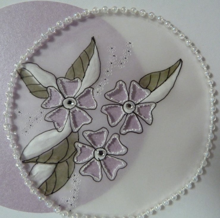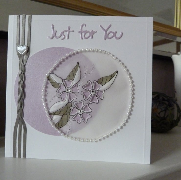 Two overlapping circles of pale lilac pearl card and parchment. The parchment has been embossed, pierced and coloured and decorated with crystals. Encircled with a pearl beads. Side of card decorated with three strands of pale green ribbon which have been plaited and embellished with white pearl plastic heart. Just For You die cut from pale lilac pearl card.