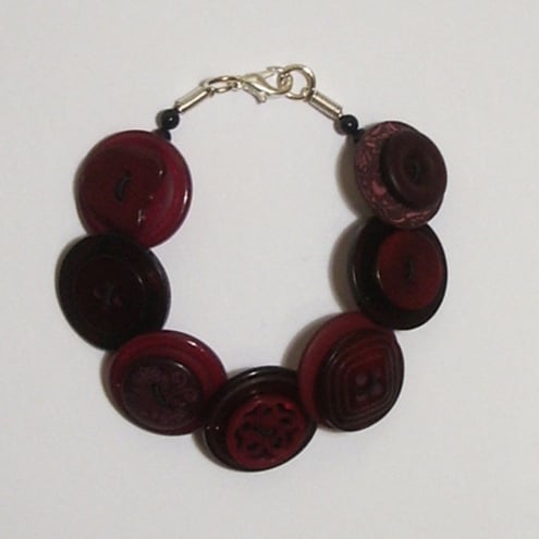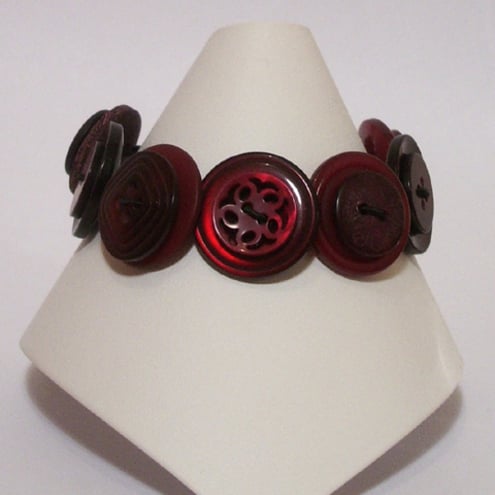 This distinctive button bracelet is rich with an assortment of cherry coloured buttons. These are threaded onto jewellery wire, which secures at the end with a silver plated lobster clasp fastener.