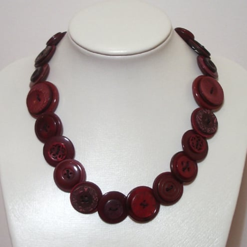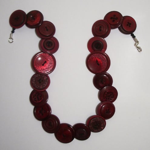 This distinctive button necklace is rich with an assortment of cherry coloured buttons. These are threaded onto jewellery wire, which secures at the end with a silver plated lobster clasp fastener.