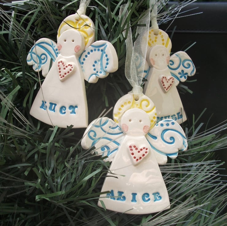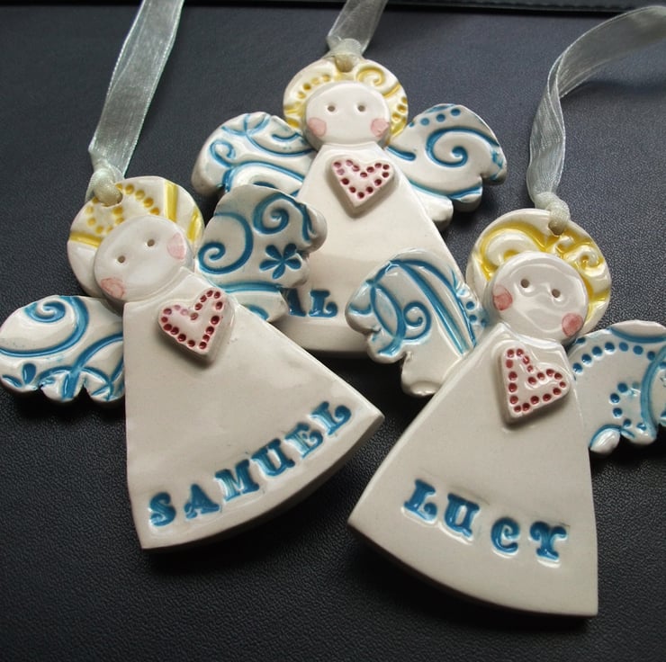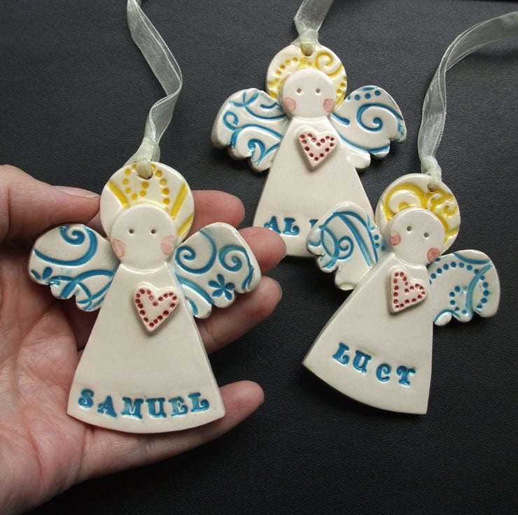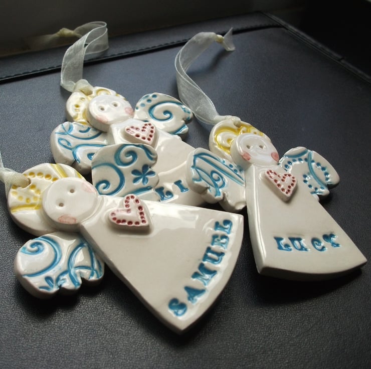 These cute little angels are made from white earthenware clay and decorated with coloured slips and glazes.