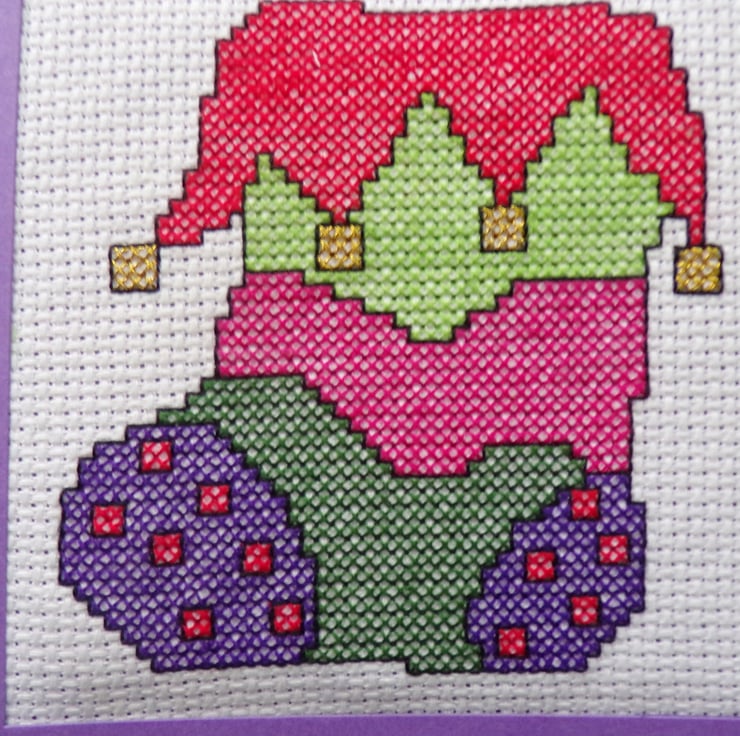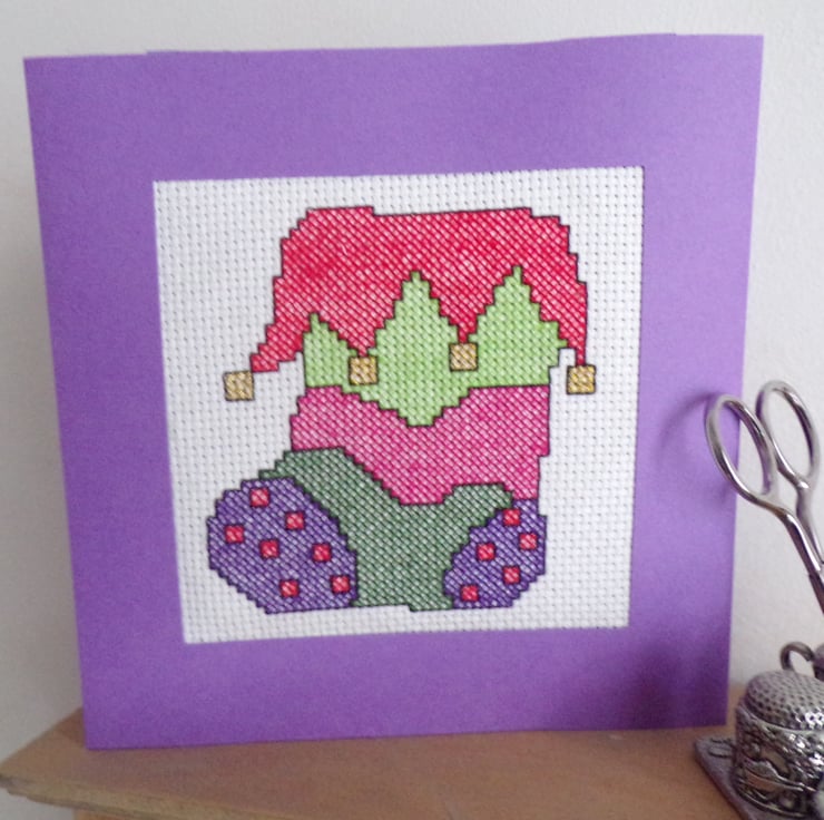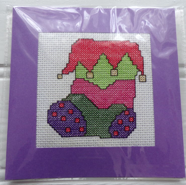 Christmas Card, Handmade Christmas Card, Christmas Greetings Card. A beautiful hand stitched Christmas Card, measuring approximately 14.5cm square. The cross stitched design of a Christmas stocking comes to you in a lovely deep purple aperture card, wadding has been placed behind the stitching to give a padded effect. The card has been left blank for your own message The card comes with a white envelope and arrives to you in a clear cellophane bag for protection.