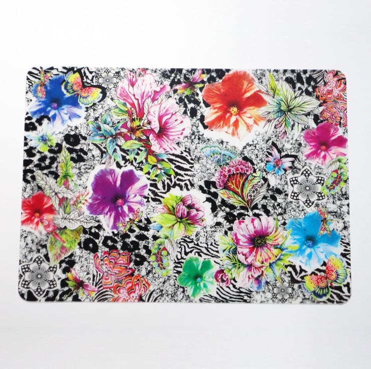 Variations of black fashionable animal skin print, form a background to the bright photographic, and hand drawn water-colour flowers. Bright patterned butterflies and dragon flies sit in the spaces between, casting black shadows on the textured ground.