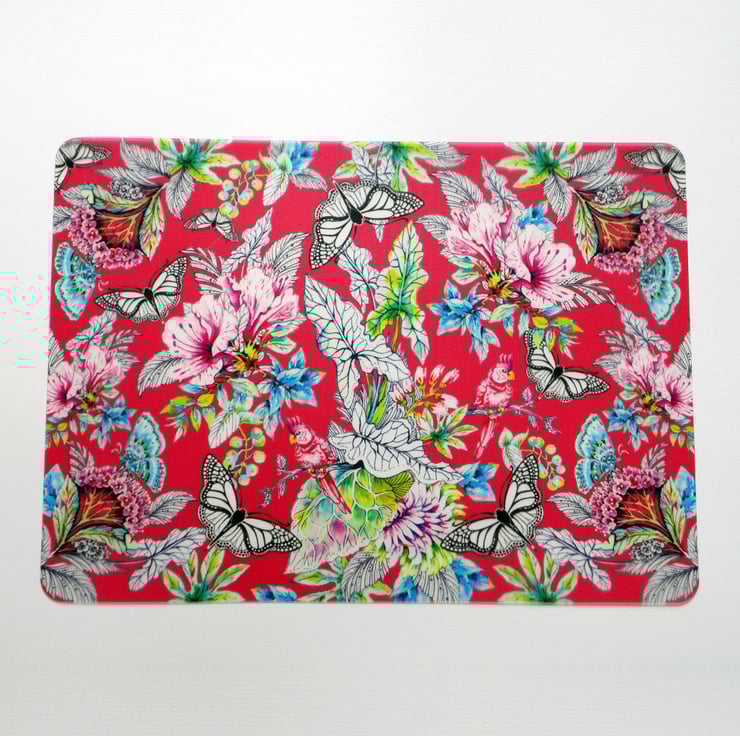 This set of Cockatoo and Butterfly Rose patterned plastic place-mats will brighten up any table, and perfect for alfesco dining and garden parties in Summer.