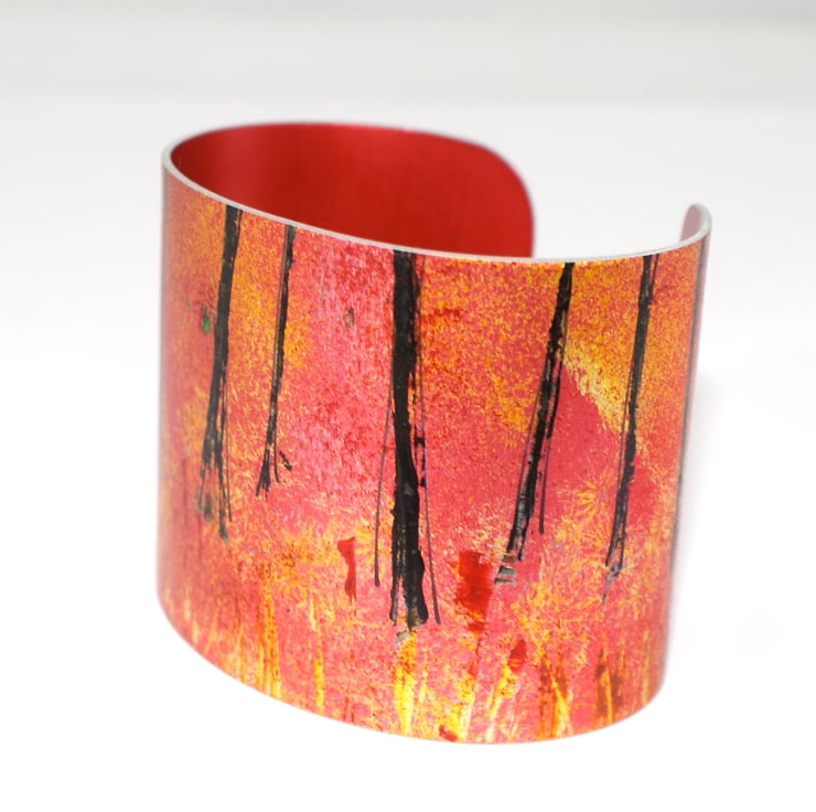 A striking hand painted aluminium cuff in red, gold and black. Lightweight and comfortable to wear. Presented in a recycled kraft gift box stamped with my logo. Please note your cuff may vary very slightly as I hand paint each one.