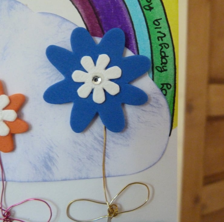 A beautiful colourful rainbow hand drawn and coloured onto quality white card. Happy birthday hand written along the green rainbow stripe. Decorated with a blue fluffy card cloud, funky foam flowers with crystal centres and wire stems and leaves. Finished off with a border of green card which has been embossed with hearts.
