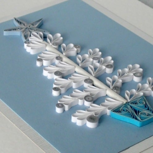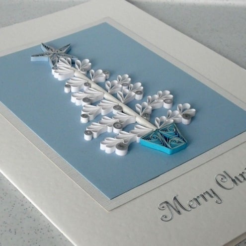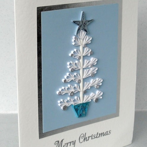 A delicate quilled Christmas tree, in shades of white, pale blue and silver mounted on a silver panel.