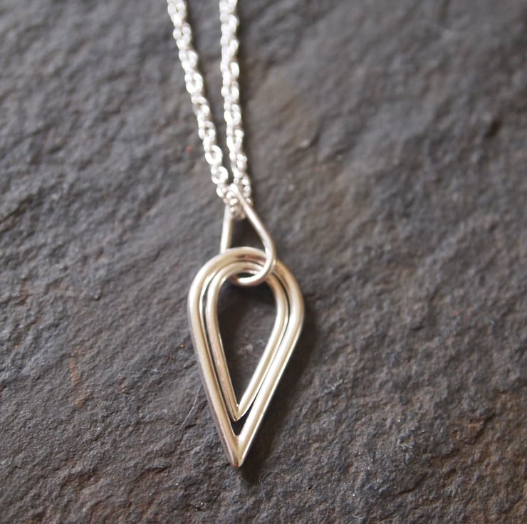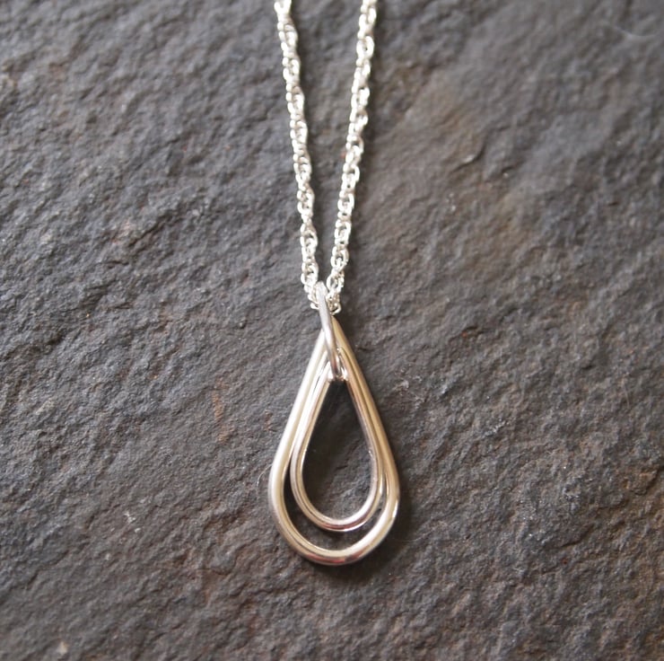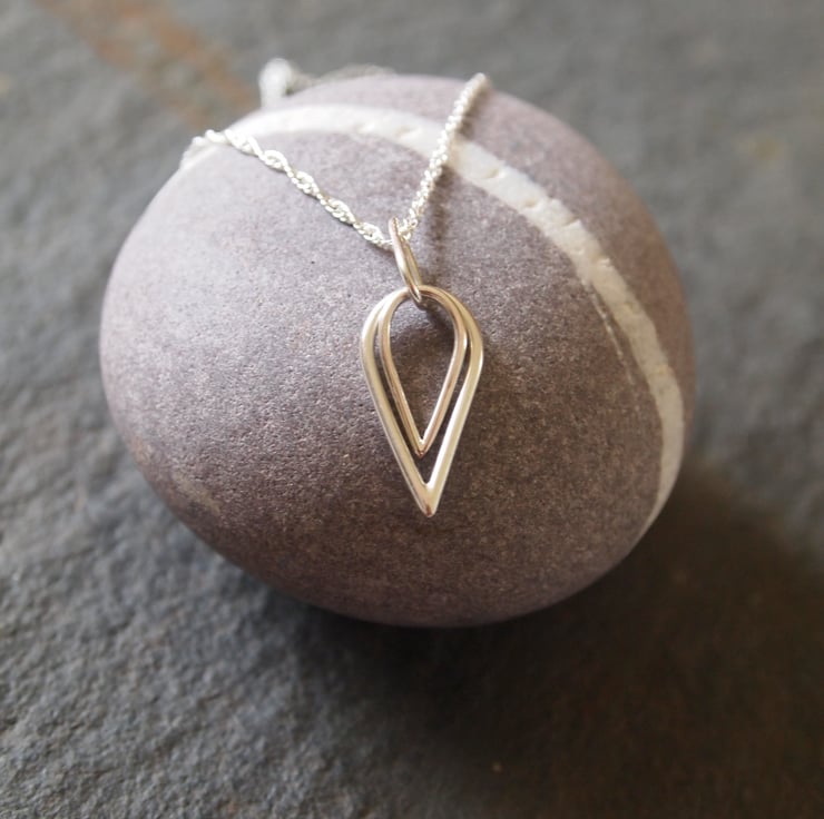 This contemporary and stylish pendant is very versatile as it can be worn either as a double raindrop or twiddled around so the point faces down. It is made from sterling silver and polished to a high shine.