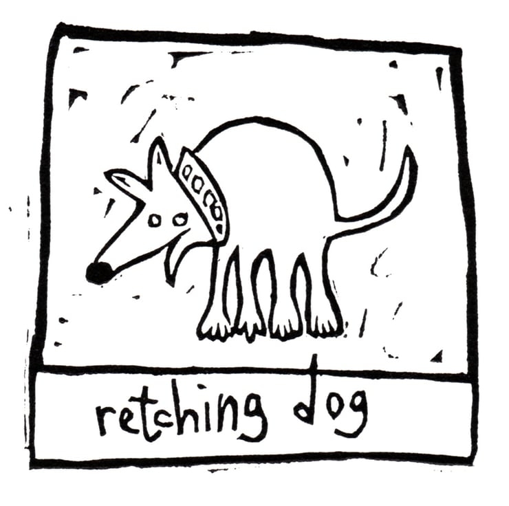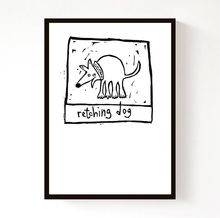 A dog lino print, but not a cute one...Pets do revolting things, but we love them any way - here is a dog looking for a bit of sympathy! One of a series of dog prints, have a look at the rest.