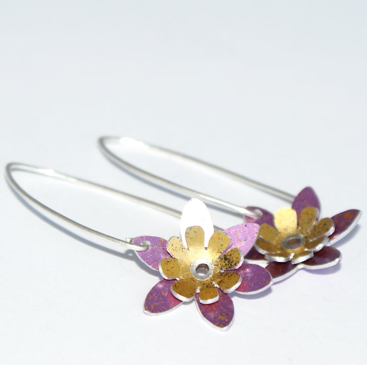 Fabulous drop earrings made from 2 layers of hand painted aluminium that I cut into flower shapes. These are then fixed together with a silver rivet and hung from some hand made ear wires.