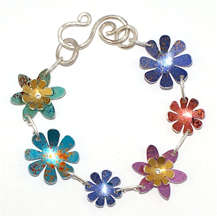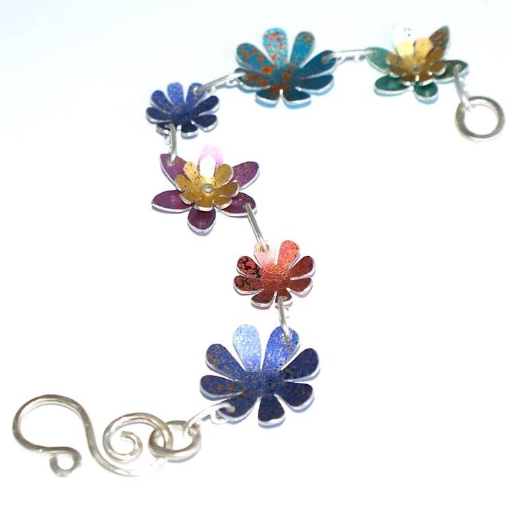A gorgeous bracelet from my spring flowers range. Made from 6 flowers of varying sizes, I paint and cut each flower from aluminium by hand. The double layered flowers are connected with a silver rivet and the flowers are linked with silver wire and finished with a hand made 'S' clasp. Please note I make this item to order. Would make a perfect gift!