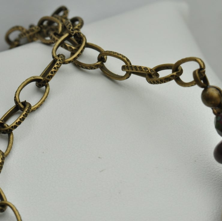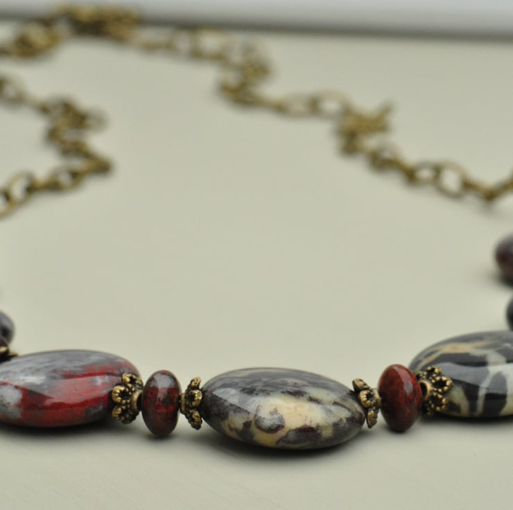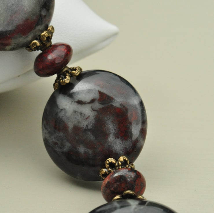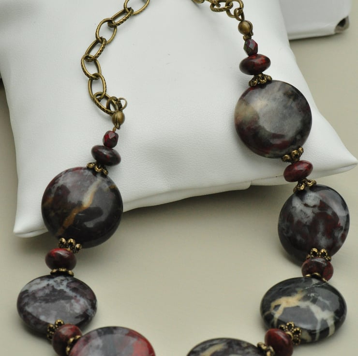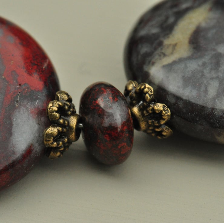 Handmade necklace made using gorgeous Bloodstone disc beads, very dark in colour with red, cream and sometimes purplish in colour markings throughout, teamed with little antique bronze plated beadcaps, red Jasper rondelles and Czech picasso red faceted beads and finished with chunky antique bronze plated chain and trigger clasp.
