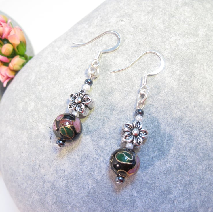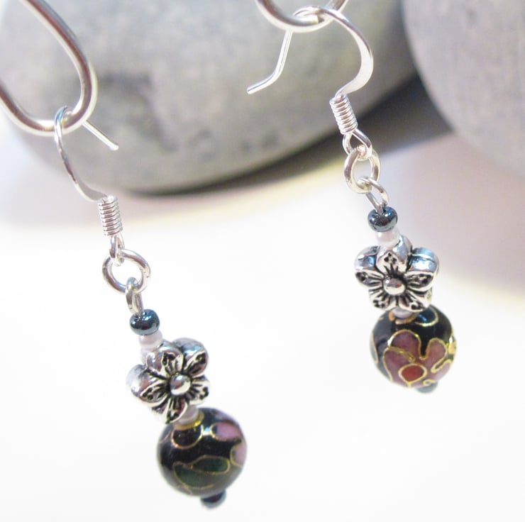 Black Cloisonne and Silver flower earrings garnished with white and charcoal glass rocaille beads.