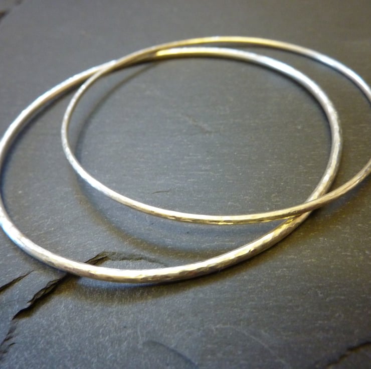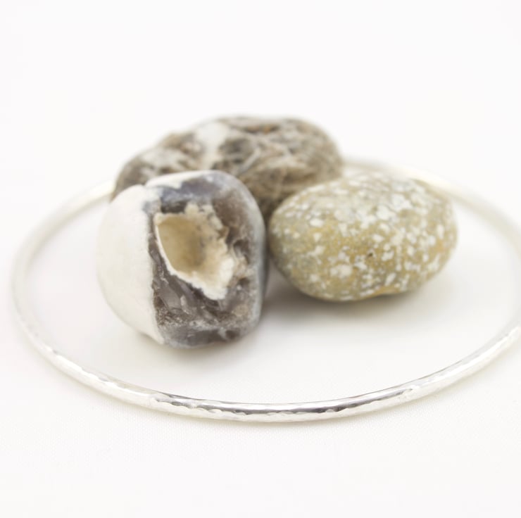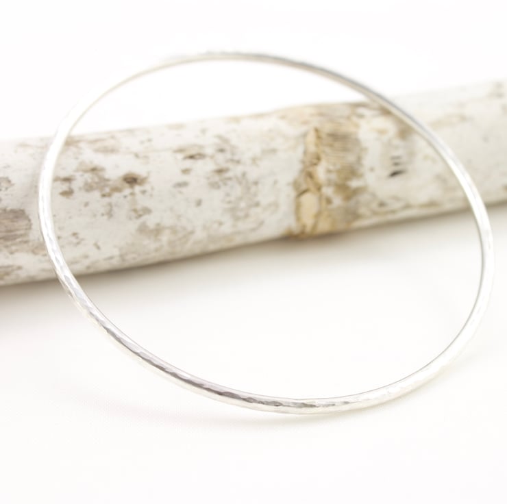 Handmade from sterling silver 2mm round wire, these bangles have been lightly hammered to catch the light and hand polished to a high shine. Simple and stylish, these bangles look lovely on their own but can also look great when 2, 3 or more are worn together - it is up to you.