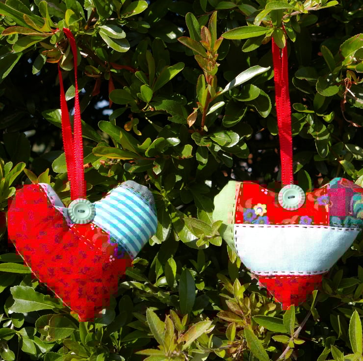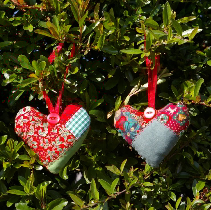 A pair of patchwork scented Christmas heart decorations. The Christmas hearts are completely hand-sewn and highlighted in shiny rayon red and green threads. They are filled with a mix of hypo allergenic stuffing and freshly crushed nutmeg, cinnamon, vanilla and dried orange peal. Each heart is patterned differently due to the nature of patchwork. The pattern also differs on both sides of each decoration. They are decorated with a red button on one side and a green button on the reverse side. They both have a long red ribbon hanging loop.
