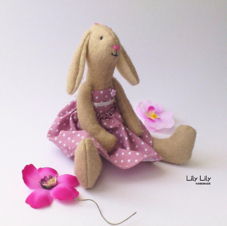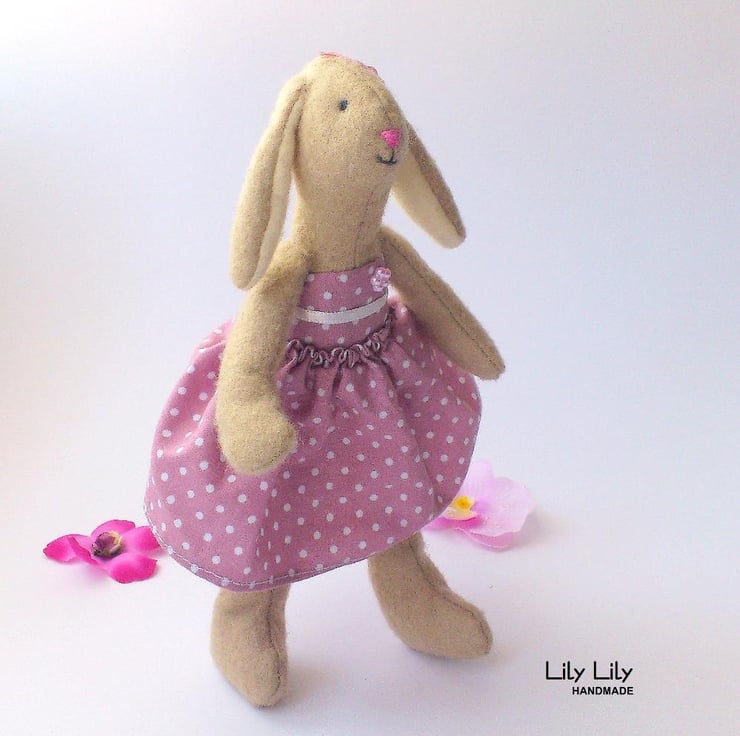 Little Lily is a cute and adorable handcrafted rabbit, dressed in a beautiful dusky pink ball gown ready for a special occasion. The dress has a white ribbon tied at the back and a pink brooch and pink ribbon on the head finishes her outfit perfectly.