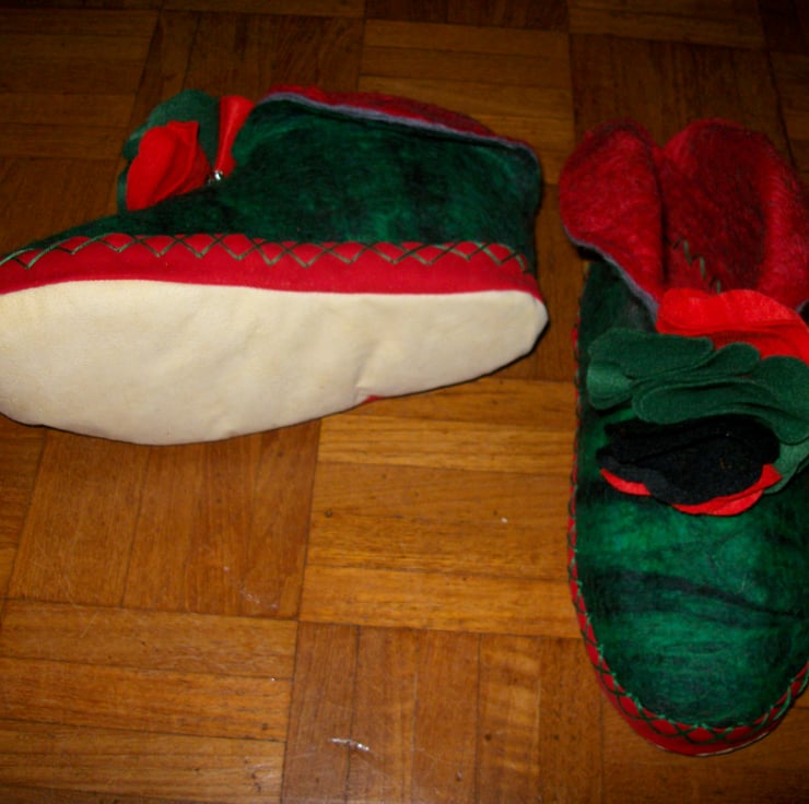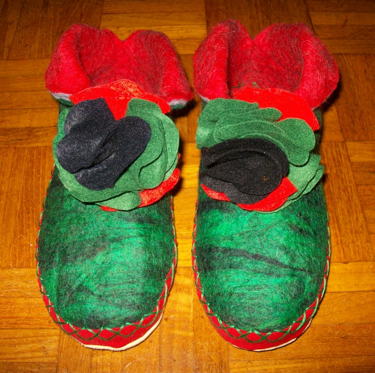 I have been learning how to make felt and was really excited to experiement with creating felt slippers. These are so useful, comfy and warm, and beautiful to look at!