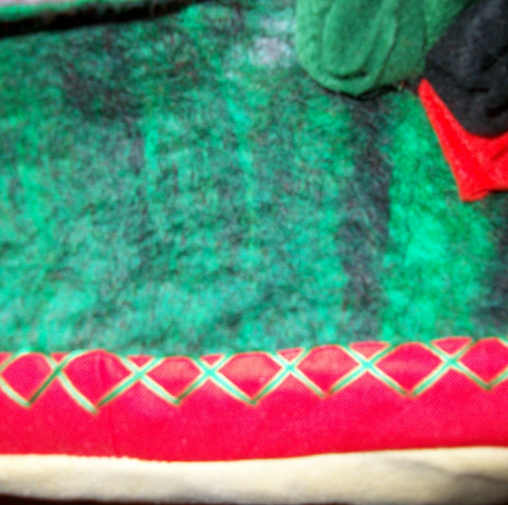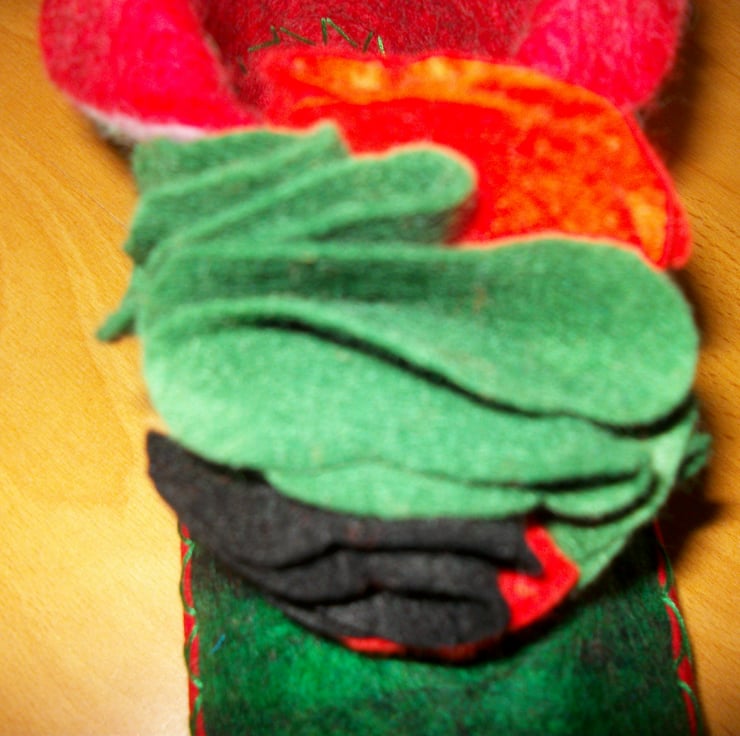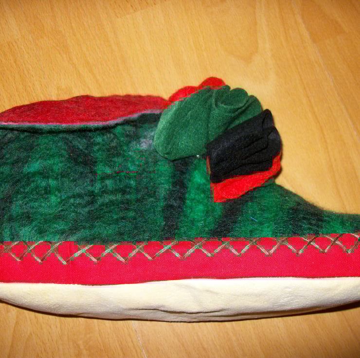 These are hand crafted slippers made by the wet felt method over a shoe last. They are constucted from 100% merino fibre and are green and black on the outside and red on the inside.The cuff folds down to show the contrasting colour on the bootie. There is a protective leather sole hand sewn to the sole of the slipper. The slippers have been decorated with a felt flower in matching colours of black, green and red.