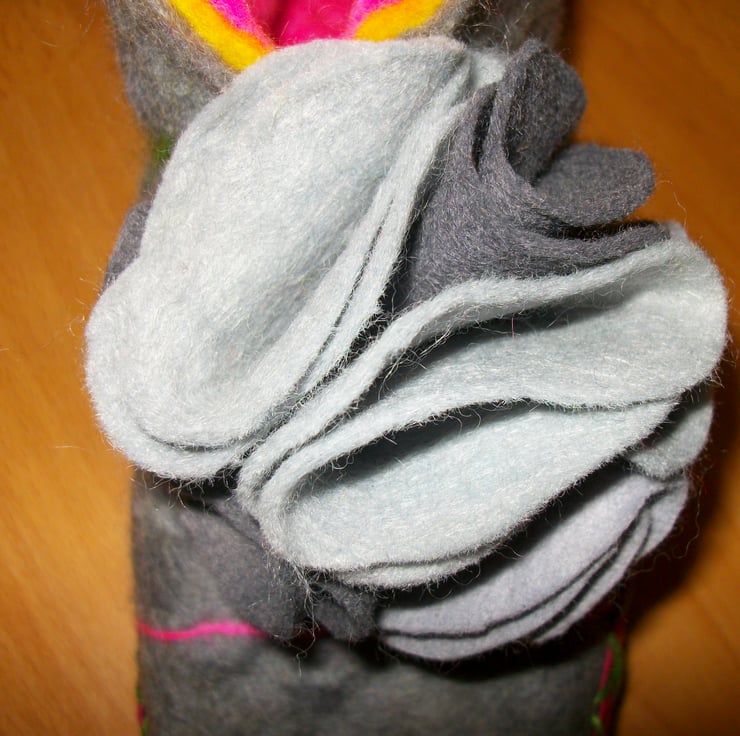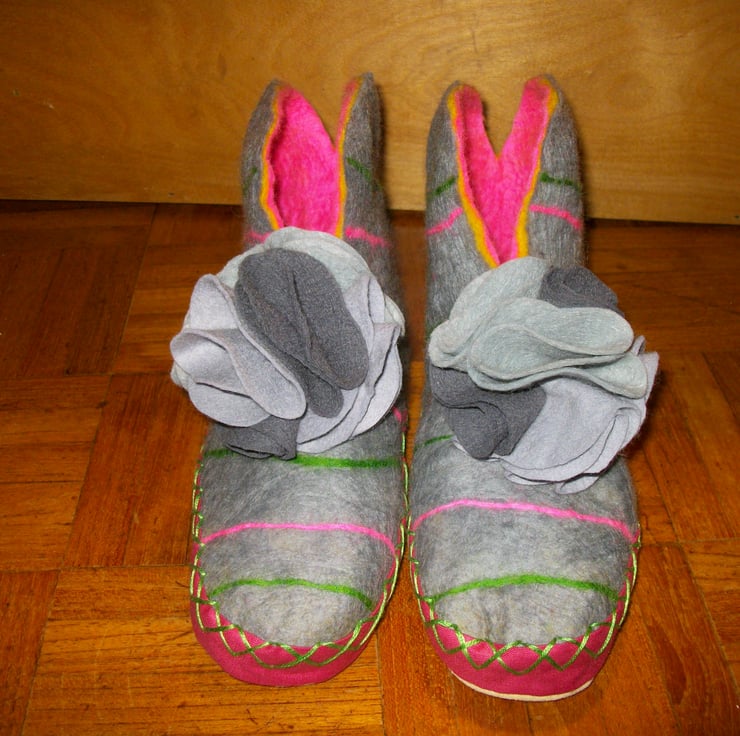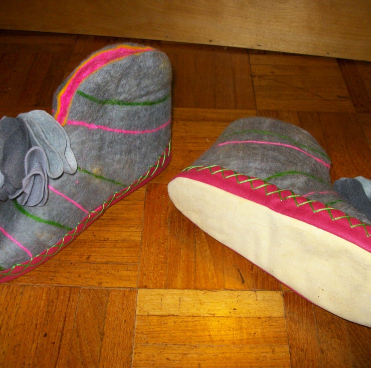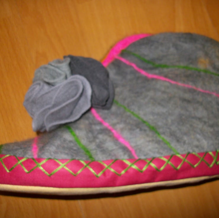 These are hand crafted slippers made by the wet felt method over a shoe last. They are constucted from 100% merino fibre and are grey on the outside, with an added stripes in pink and green, and pink on the inside. There is a protective leather sole hand sewn to the sole of the slipper. The slippers have been decorated with a grey felt flower.