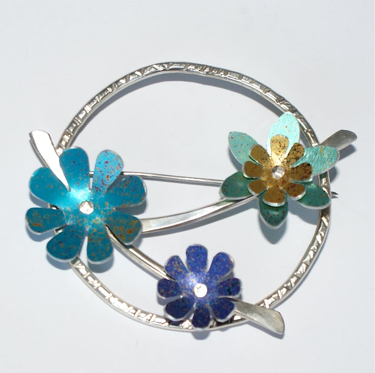 WAS £47.95 NOW £32.95 - Gorgeous brooch made from sterling silver and hand painted aluminium. The hand cut flowers are riveted to a forged silver branch which is soldered to the textured silver wire frame. The brooch pin is made from stainless steel for strength. Please note your brooch may vary very slightly as I make each one to order.