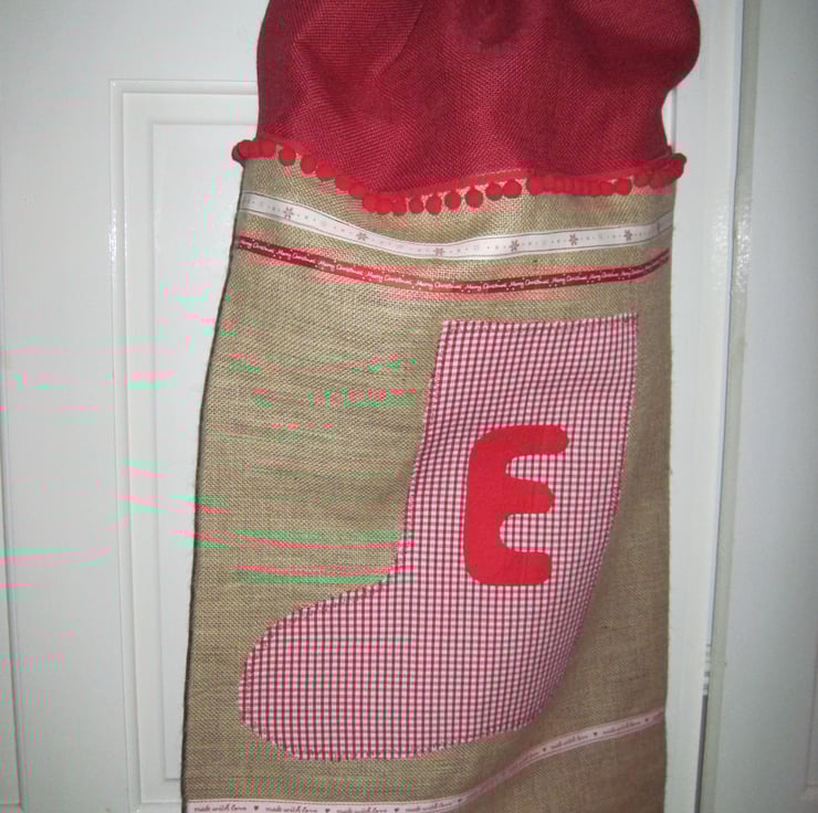 Trimmed with ribbons and bobbles and personalised with your child's initial this sack will put a smile on any child's face. It is finished off with a strong calico drawstring ribbon to hang on your child's door or bedpost. The child's initial will be made from red felt.