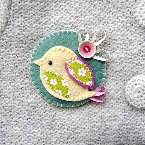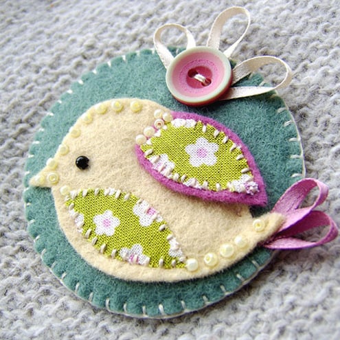 This is a lovely handmade fabric brooch. It features a little felt bird with appliqued wing and belly and is edged with pretty beads. It is mounted onto a circular teal felt base and is finished with a button and ribbon detail. It has a brooch backing for easy attachment.